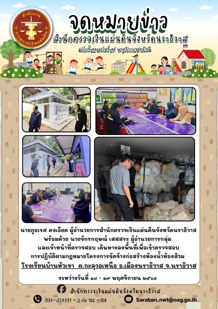 การตรวจสอบการปฏิบัติตามกฎหมายโครงการจัดจ้างก่อสร้างห้องน้ำห้องส้วม โรงเรียนบ้านหัวเขา ตำบลกะลุวอเหนือ อำเภอเมืองนราธิวาส จังหวัดนราธิวาสกิจกรรมตรวจสอบ, ภาพกิจกรรมพฤศจิกายน 19, 2025ธันวาคม 16, 2025 Post Views: 60