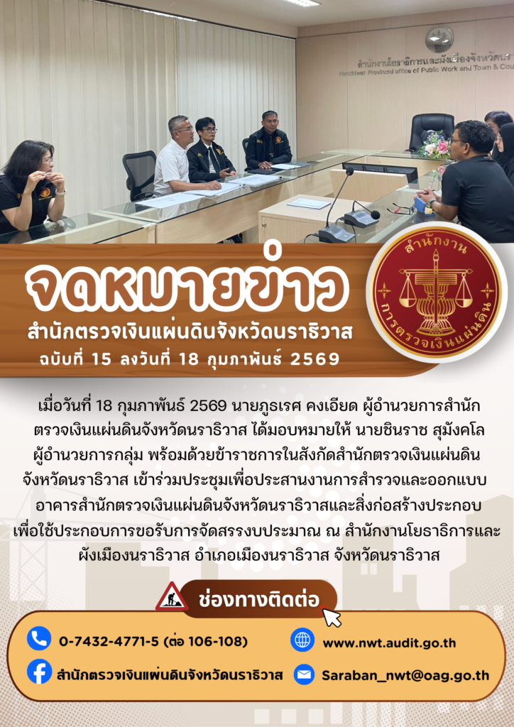 ประสานงานการสำรวจและออกแบบอาคารสำนักตรวจเงินแผ่นดินจังหวัดนราธิวาสและสิ่งก่อสร้างประกอบเพื่อใช้ประกอบการขอรับการจัดสรรงบประมาณ ณ สำนักงานโยธาธิการและผังเมืองนราธิวาส อำเภอเมืองนราธิวาส จังหวัดนราธิวาสกิจกรรมอื่น ๆ, ภาพกิจกรรมกุมภาพันธ์ 18, 2026กุมภาพันธ์ 19, 2026 Post Views: 35