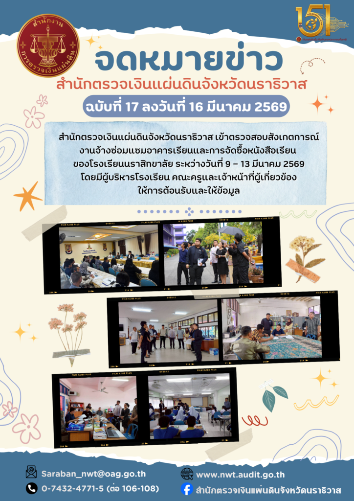 การตรวจสอบสังเกตการณ์งานจ้างซ่อมแซมอาคารเรียนและการจัดซื้อหนังสือเรียนของโรงเรียนนราสิกขาลัยกิจกรรมตรวจสอบ, ภาพกิจกรรมมีนาคม 16, 2026มีนาคม 24, 2026 Post Views: 15
