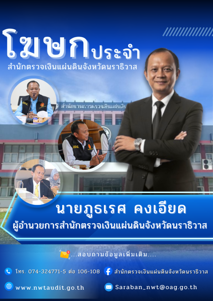 สำนักตรวจเงินแผ่นดินจังหวัดนราธิวาส เลขที่ 424 ถนนไทรบุรี ตำบลบ่อยาง อำเภอเมืองสงขลา จังหวัดสงขลา 90000 โทร. 0-7432-4771-5 ต่อ 106-108